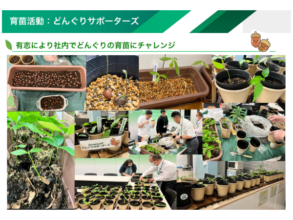 社内有志の「どんぐりサポーターズ」や会員企業とともに、現地植生のどんぐりを採取し社内で育苗する取り組みを