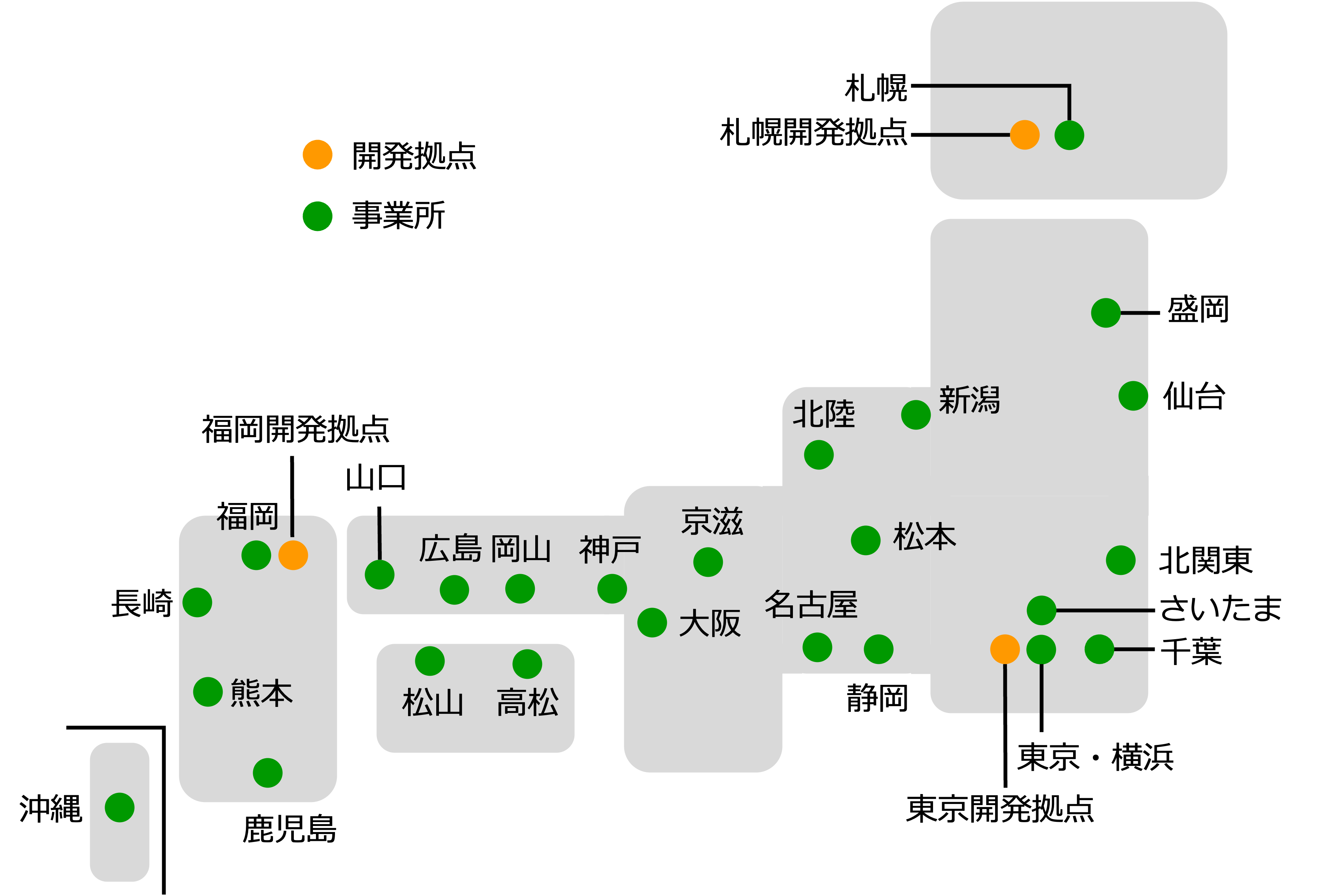 国内3拠点をベースにソフトウェアを自社開発しています。また、全国25拠点の直販・サポート体制を構築し、お客さまへの迅速なサービス提供を実現しています。